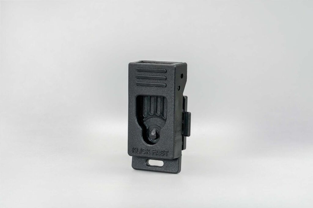 Le support Klick Fast Quad MOLLE se fixe solidement à tout système MOLLE et offre un montage stable, léger et robuste — idéal pour une utilisation mains libres de caméras corporelles, radios et appareils mobiles.
