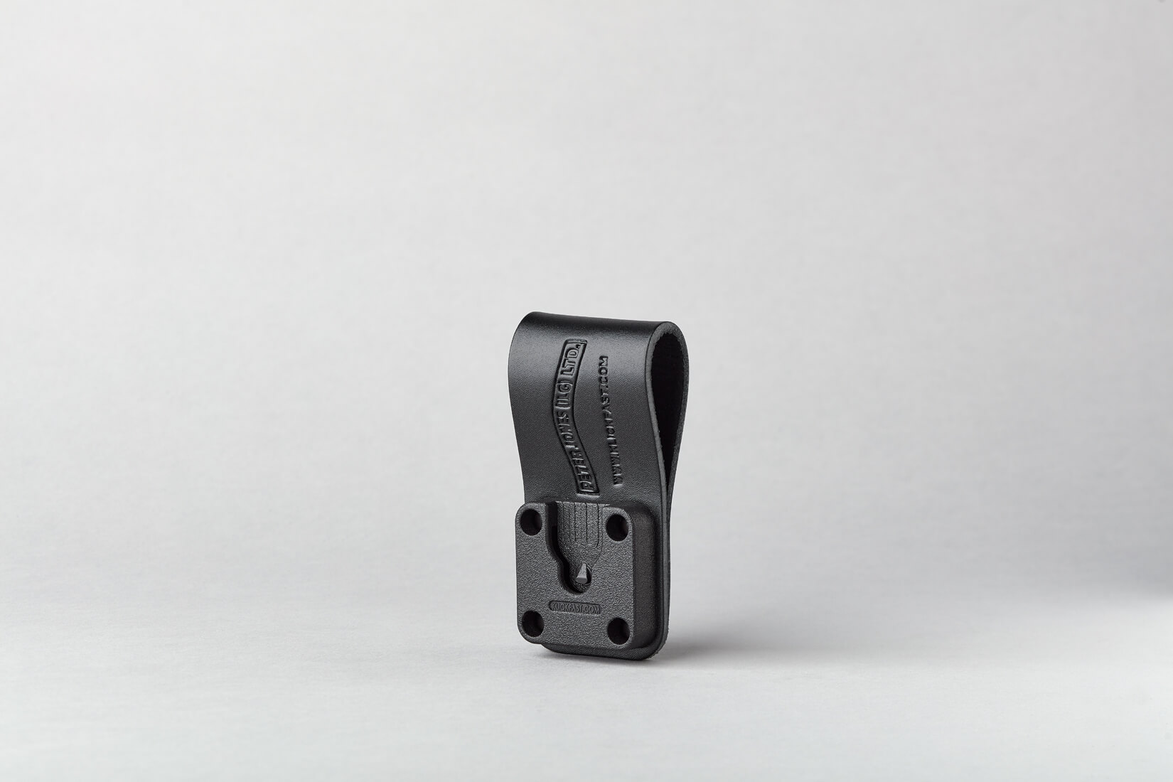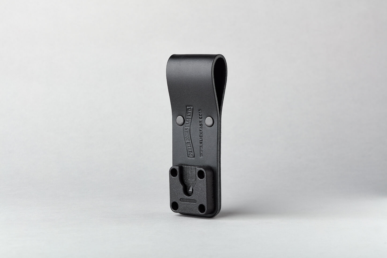 Un passant de ceinture en cuir, équipé d’un dock Klick Fast, à travers lequel une ceinture peut être passée avant d’être portée avec un pantalon. Permet de porter des appareils sur une ceinture. Cette version positionne le dock Klick Fast au niveau de la taille.